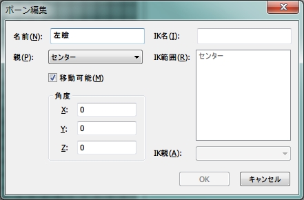 「左瞼」「右瞼」ボーンをそれぞれダブルクリックして、親を「センター」に、その下の移動可能にチェックを入れてOKを押します。
