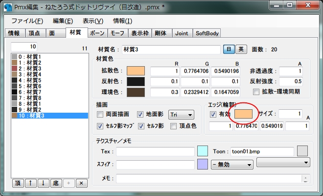 エッジについてさらに簡単な方法としては、特にエッジ系の材質モーフを作る予定が無ければ、PMXEのエッジ欄の「有効」のチェックを外すか、材質モーフを作るのであればサイズを0にしてあげれば簡単にエッジを切ることができます。