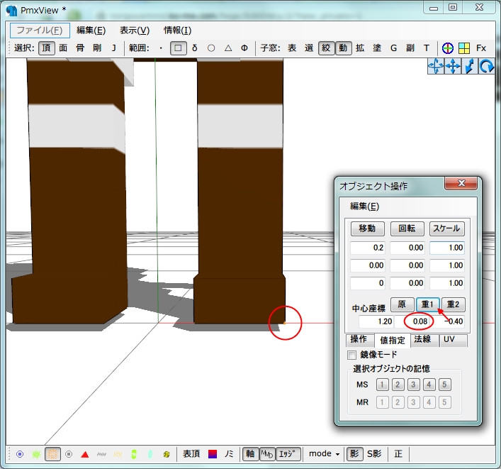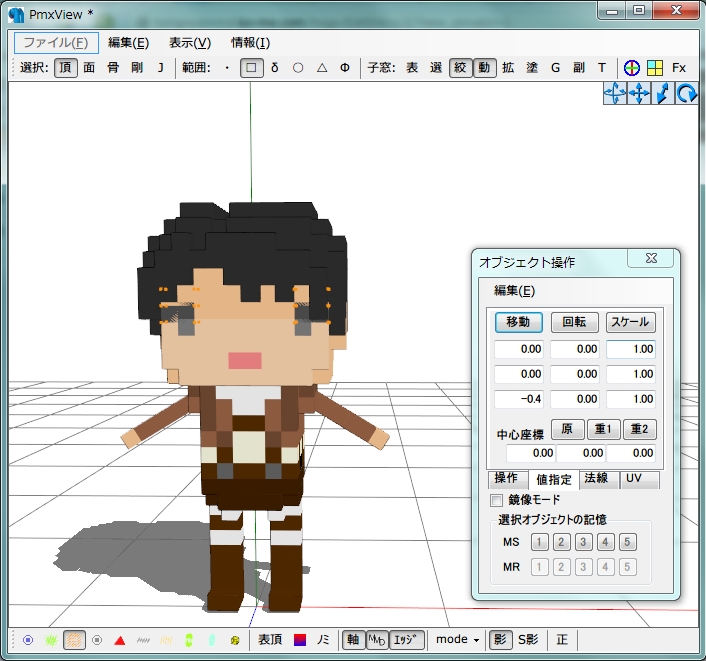 ドットモデルのまばたきモーフの作り方 その2 ドットモデル 2014年01月31日 2度目まして、鶏冠です。 前回に引き続き、ドットモデルのまばたきモーフを作っていきます~! (ねたろうさんに許可頂き、ねたろう式ドットリヴァイをお借りしています。ありがとうございます!) 今回の工程は、②PMXエディタで瞼パーツをモデルに組み込むになります。 あ、作業に入る前にもしものことがあるといけませんので、モデルさんのコピーを作成しておいてください。 気をつけているつもりでもやってしまうんですよね、誤上書き保存……。 それでは準備ができましたらエディタをご用意くださいませ! 開いたエディタにモデルを読み込みます。 ふふふかわいいですねぇ。 表示されたらモデルが表示されたエディタに、前回作った瞼パーツの.pmdファイルをドラッグ&ドロップ! するとこんな画面が出てきますので、 インポート方式→追加 モデル調整→全部チェック にしてOKを選択。 すると…… /ジャン!\ ……(´∇`) えー、特に見た目に代わり映えはありませんが、ちゃんとパーツが追加されていますのでご安心を! 取り敢えずサクっと確認しておきましょうか。 PmxViewの方で、「頂点/材質マスキング[F3]」パネルと、後ですぐ使うのでついでに「オブジェクト操作[F4]」パネルも出します。 それぞれのファンクションキーか「絞」と「動」って書いてあるところをクリックです! 「オブジェクト操作」パネルは「値指定」タブに変えておきます。 そして「頂点/材質マスキング」パネルの材質を選択。 右の「反」を選択して、一旦モデルを全非表示にした後、下の方にある「材質2」「材質3」を選択してください。 はい!ちゃんといました!瞼パーツです! この材質2・3が瞼になります。 わかりにくいわ!という方は、Pmx編集ウインドウの材質タブから任意で名前を変更しておくといいかも知れません。 これからこの瞼パーツを顔の表面に向けて移動させていきます。 この状態で瞼パーツを囲むようにドラッグして、頂点を全て選択します。 「オブジェクト操作」パネルの移動Z軸の欄に、-(1ドット分)……つまり今回の場合は-0.4と入力します。 入力しただけでは移動しませんので、上にある「移動」をポチっとな、と。 ……移動はしましたがこれではまだ瞼がどこにあるのかよくわかりませんね。 「材質/頂点マスキング」パネルの「全表示」を選択します。 うーん、まだ表面まで来ていないようです。 このまま「オブジェクト操作」で表面に来るまで移動をポチポチしていきます。 ポチっ……あ、1回で出た。よしよし。 しかしこのままだと寄り目に見えますね。 ちょっと横に移動させて目が瞼の真ん中に来るようにします。 一旦「材質/頂点マスキング」パネルの「材質」を選択し、取り敢えず左瞼のみをドラッグして頂点選択。 「オブジェクト操作」パネルのZ軸を一旦0に書き換えて、X軸を-(1ドットの半分)……つまり-0.2にして、移動をポチっ。 「材質/マスキング」パネルで全表示にしてみました。なんだかいい感じ。 右瞼も同様に、X軸を今度は反対の0.2にして同じようにポチってみます。 うんうん、いい感じじゃないかな。 あれっでもよく見たらドットリヴァイさんと瞼パーツ、横軸ずれてない? アップにしてみたらやっぱりリヴァイさん0.08ほど浮いてますね。 (後でねたろうさんに聞いてみたら、MMDに読み込んだ時に少し床にめり込んでしまう仕様のため、その分浮かせているそうです) お借りしたモデルさんですので、リヴァイさんの方に瞼パーツを合わせておきます。 先ほど出した0.08分、瞼パーツもY軸移動させましょう。 あ、忘れずX軸の数値は0に書き換えてね! よし、ぴったり合いました。 しかしこのままではリヴァイさん、ずっと半目のままになってしまいます。 しかも材質チラついてる! 少しパーツを後ろに下げて、頭の中に格納しましょう。 頭からはみ出さなければどのくらい下げても良いのですが、Z軸0.005くらいがオススメです。 あまり表面から遠いとまばたきモーフを作った時、まばたきの過程が見えにくくなってしまうので……。 逆に0.001程度だと顔の表面に瞼パーツの材質がチラつく可能性がありますので、私の場合は0.005にしています。5刻み覚えやすい。 うん、スッキリしましたね。 お気づきかも知れませんが、今回はZ軸打ったりそれを消してX軸打ったり……なんてやってきた一連の操作は、全部の合計の数値を入力して一括で移動させることも出来ます。 今回のねたろう式ドットリヴァイの場合はX軸-0.2(0.2)、(ちょっと特殊な場合でしたが)Y軸0.08、Z軸-0.795です。 計算がすぐに出来る方は最初から数値を計算して入力、移動ポチり!だけでもいいかと思いますが、ドットがズレているなど、こういう特殊なケースが出る場合もありますので、最初はこうして一旦顔の表面に瞼パーツを出して確認してやった方がいいかも?と私は思います。 さてさて、これでモーフを入れる準備は整いました! 後はモーフを入れるだけ