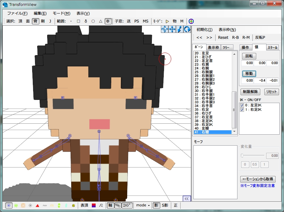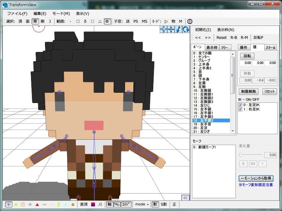ドットモデルのまばたきモーフの作り方 その3 ドットモデル 2014年02月02日 【2015/05/06】記事を書いたのがモデルを作り始めて少しの頃で、情報が古かったり間違っているところがありますので、今からでも訂正できるところを注釈などで訂正しました。 3度目まして、鶏冠です。 今回はいよいよ佳境!③エディタでモーフをつけるの手順を追っていきたいと思います! 毎度の如く、ねたろう式ドットリヴァイをお借りしています~! ねたろうさんありがとうございます! 実はボーンモーフと頂点モーフ、方法が2つあるのですが、いっちばん最初のエディタ触りたてな私が辿ったボーンモーフの方で今回はご説明をしたいと思います。 頂点モーフはこの後、「応用編」でやろうかと思っていまして。 できる方は頂点モーフの方で説明を変換して読んでくださると嬉しいです! 内容ですが、もう、超簡単です。 前回まで頂点選択して移動して~という作業より簡単です。 佳境とか言っておきながら、もう頂上超えて下る最中です。 そんな感じで今回もよろしくお願いします! ではPmxViewの方に戻りまして! メニュー>表示>TransformView[F9]でウインドウを新しく出します。 出ましたウインドウがこちら! PMDエディタの方だとちょっと名称が違ったり、ウインドウが2つに別れてたりとかしていた気がします。 あと右側の操作パネル?を「値」タブに変えておきます。 今回も数値を入力して動かしていきますよ~! ちなみに、鶏冠流まばたきモーフの仕組みは、基本的に瞼パーツを移動させてモデルの表面に出す事によってまばたきを再現する仕様となっております。 重複しますが、頂点モーフでできるやい!という方はそちらでも全然構いませんので、お好きな方でどうぞ~。 では早速モーフ登録していきましょう! まずは左瞼ボーンを選択して、Y軸-0.4(1ドット分)、Z軸-0.01を入力して、「移動」をポチリ。 片目ウインク状態になりました!(かわいい) ちなみにZ軸の内訳ですが、0.005分は瞼パーツが顔の表面と同じ位置に来るための数値だというのは今までの手順の中でお分かりかと思います。 残りの0.005は材質がチラつかないようにするため、さらに瞼パーツを顔の表面から前に出す分となっています。 個人的な感想の域ですが、下の材質の色が濃いほど、上に重なる材質の色が薄いほど、材質がチラつきやすくなっている気がします。 もしかしたらモデルさんの色によってはもう少し前に出してあげないと、瞼の肌色の下にある目の影部分の色がチラついてしまうかもしれません。 そこは適宜調節してあげてくださいね。 では右瞼の方も同じように選択→移動! ちゃんと両目が閉じられましたね。 この状態で、メニュー>編集から「現在の変形状態で新規ボーンモーフを追加」をクリックします。 すると、追加しますか?といったことを聞かれるので、はいを選択します。 ボーン移動がリセットされ、右下のモーフ一覧に新規モーフが追加されました! このままですと「新規モーフ1」という名前で何がなんだか分からないので、モーフの名前を変更しましょう。 Pmx編集ウインドウに戻って、モーフタブを選びます。 さっき作った「新規モーフ1」があるので、選択して「まばたき」に名前を変更してあげてください。 ついでに右にある「パネル」も「左上(目)」に変えておきます。 これでまばたきモーフは出来ましたが、ボーンモーフはこのままですとMMDに読み込んでも一覧に表示されませんので、手動で表示枠に登録してあげる必要があります。 表示枠タブを選択して、左の[表情]を選びます。 右のモーフから「まばたき」を選び、右にある「+追加」をポチリ。 はい、これで表示枠にも登録できました! この状態でファイルを保存してMMDで読み込めば、まばたきすることが出来ます。 ね、簡単でしょ? ではさらに他の目モーフも作っていきましょう! TransformViewで全部作ってから名前変更→表示枠と移っていくと楽ですね。 ●「半目」 左瞼・右瞼→Z軸-0.01 ●「じと目」 左瞼・右瞼→Y軸-0.2(半ドット分)、Z軸-0.01 ●「ウィンク」 右瞼→Y軸-0.4(1ドット分)、Z軸-0.01 ●「ウィンク右」 左瞼→Y軸-0.4(1ドット分)、Z軸-0.01 ※以前ウィンクモーフを「右ウインク」「左ウインク」と表記していましたが、全ての基本となるあにまさ式ミクさんが「ウィンク」「ウィンク右」となっているので、モーフ名は出来るだけあにまさ式ミクさんに合わせた方がモーションを読み込んだ時に幸せになれます。 ここからちょっと蛇足説明です。 この「半目」モーフはかなりイケてる奴でして。 通常まばたきモーフだけだとモーフの半分くらいまでが顔の裏で行われていて見えないのですが……例えばこんな状況。 まばたきが少し入っていますが、瞼パーツがまだ裏にいるので見えませんね。 こういう時に便利なのが「半目」モーフ! 半目モーフを最大まで入れてあげると…… ほらご覧のとおり! ちゃんと少量のまばたきも綺麗に出すことができます。 是非ご活用いただければと思い